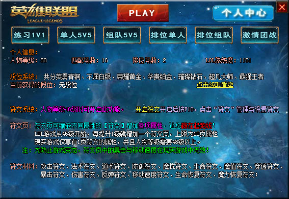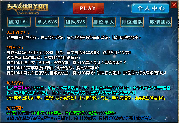 LOL为传奇副本模式,人物进入召唤师峡谷时等级只有【1】级,初始金币为1000枚;